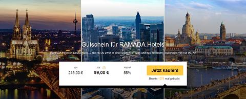 Städte wie Frankfurt, Stuttgart, Leipzig oder Köln erleben zum Schnäppchenpreis: 3 Tage zu zweit für nur 99 € im RAMADA Hotel bei travelbird.de - zur Auswahl stehen 14 verschiedene Hotels der 3- bis 4-Sterne-Kategorie in ganz Deutschland. Natürlich inklusive reichhaltigem Frühstück vom Buffet. 1 Kind bis 6 Jahre übernachtet kostenfrei im Zimmer der Eltern und es lassen sich mehrere Gutscheine für einen längeren Aufenthalt kombinieren - mit Gültigkeit bis 2017. Zum Deal >>